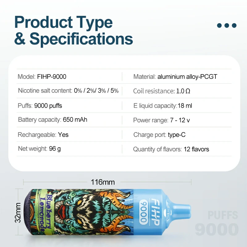 Tärkeimmät ominaisuudet FIHP 9000 puhallusta sisältää 1,0 ohmin mesh-kelan tehostettua makuaikana, 18 ml:n kapasiteetin säiliön ja vaihtoehdot höyrystysvoimakkuudelle (2% ja 5%). Sen muotoiluun täydentää tyylikäs RGB-valoilmaisin, joka lisää visuaalista ulottuvuutta höyrystysistuntoihisi.